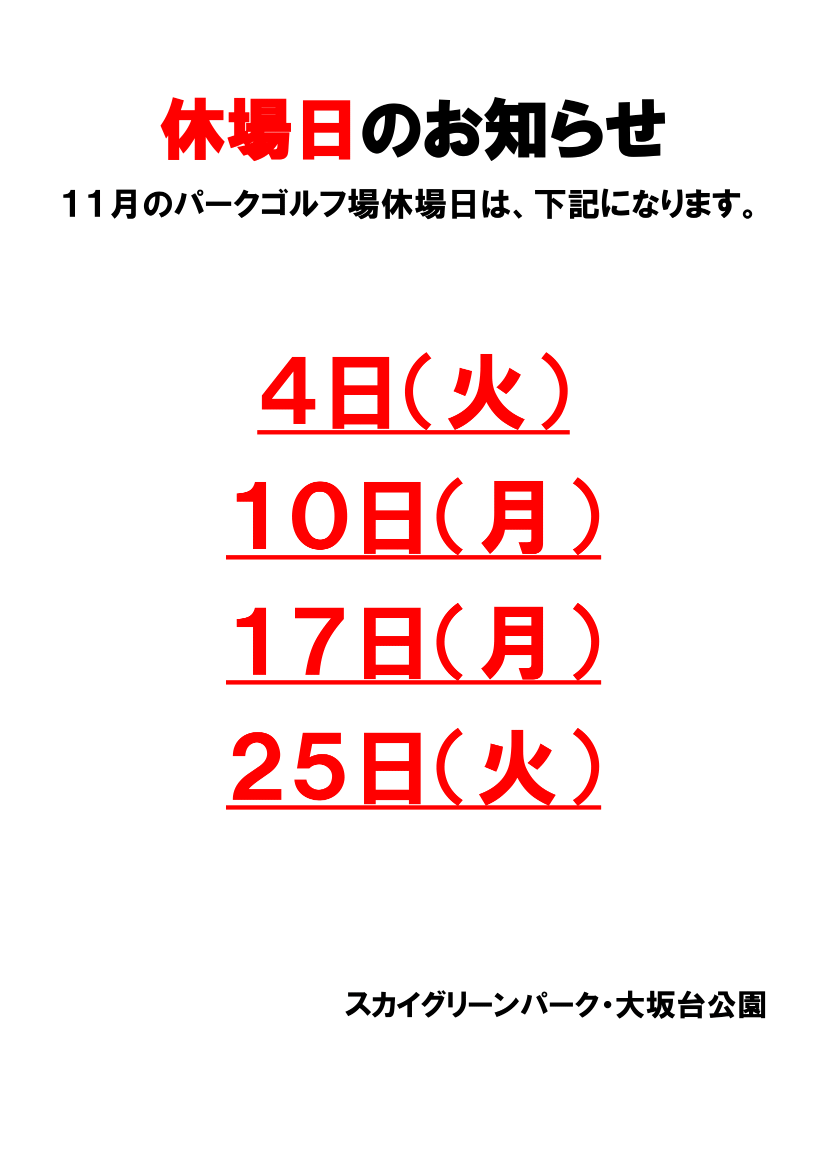 11月パークゴルフ場休園日のお知らせ