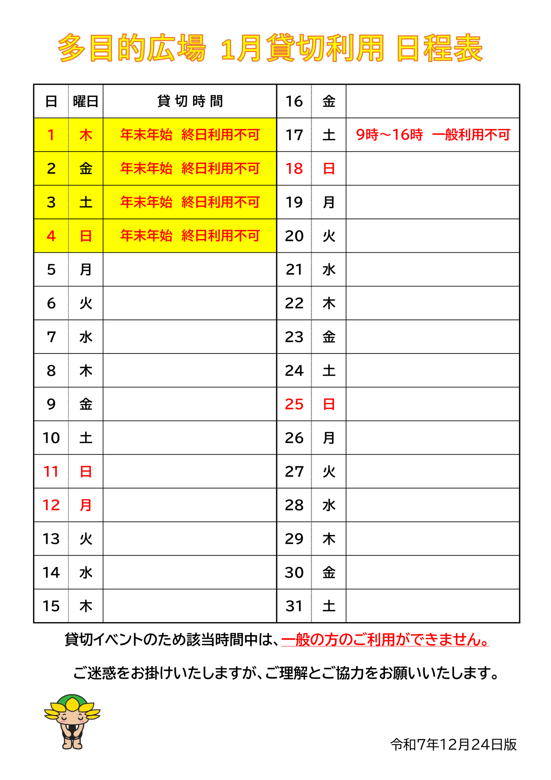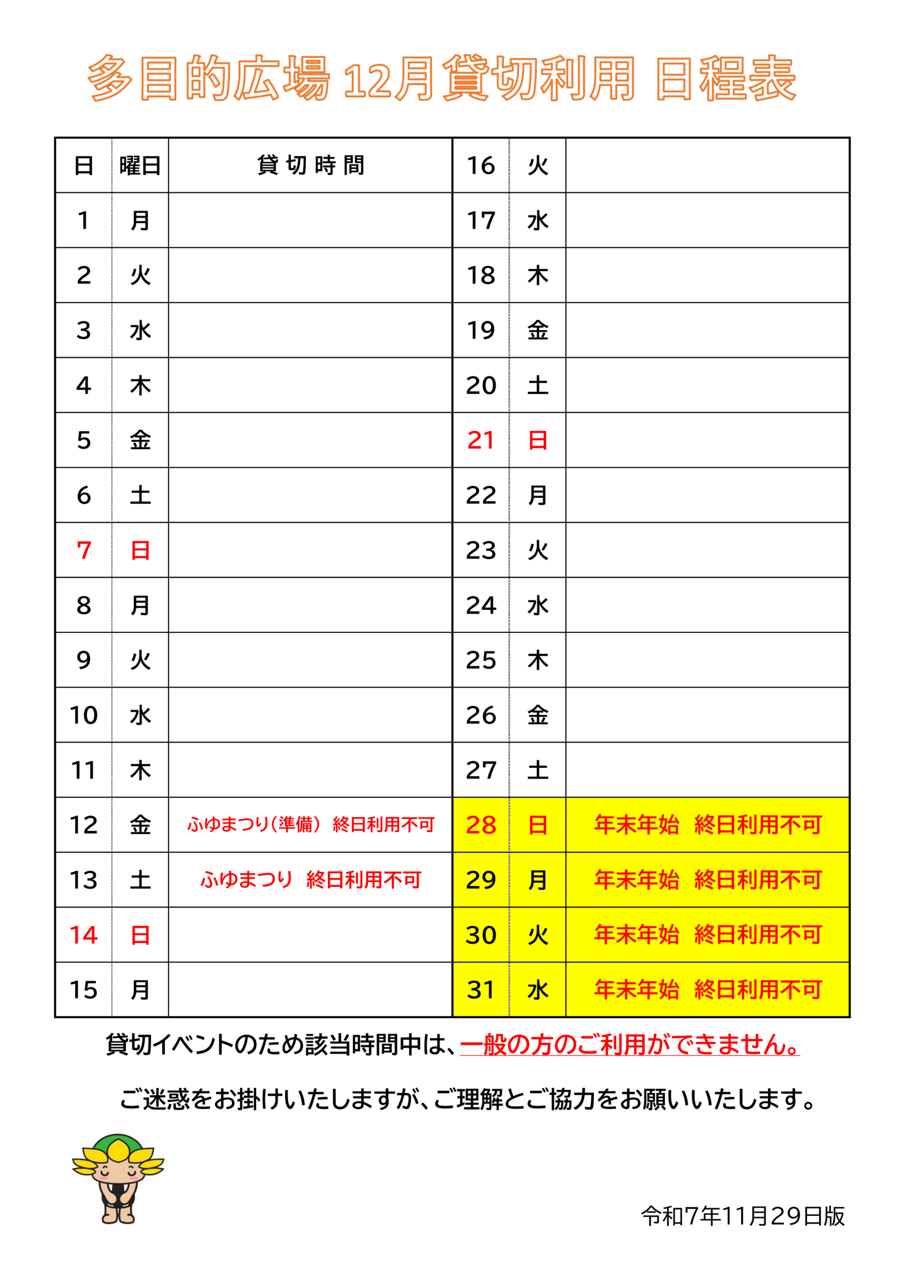 12月の多目的広場、貸切利用のお知らせ