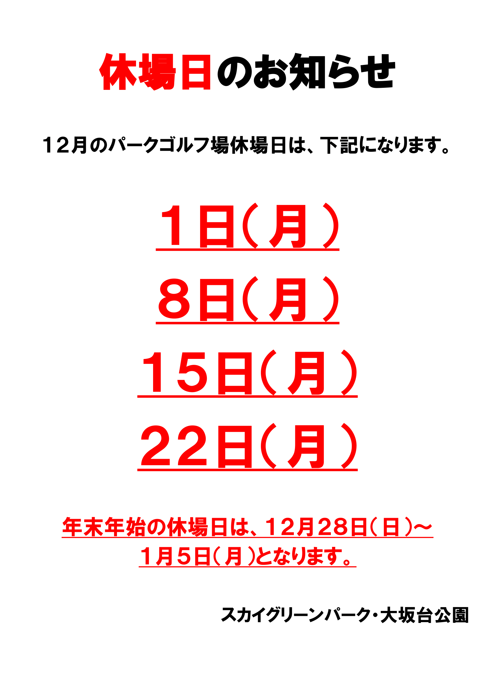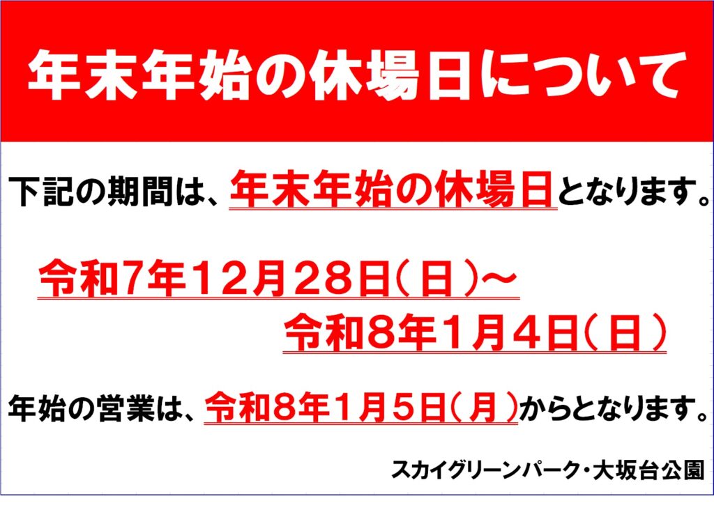 年末年始のお知らせ 多目的広場、パ