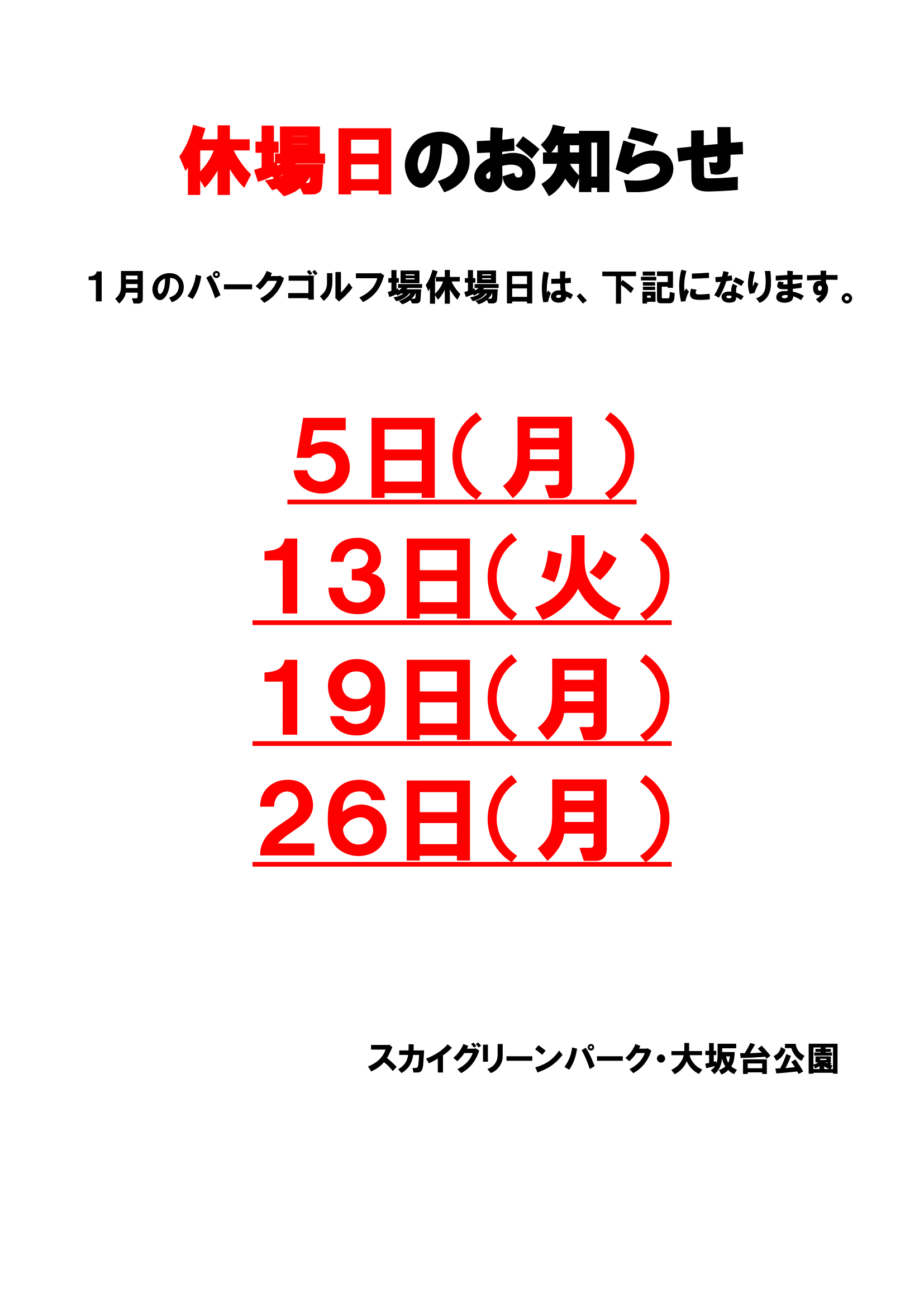 1月パークゴルフ場、休場日のお知らせ
