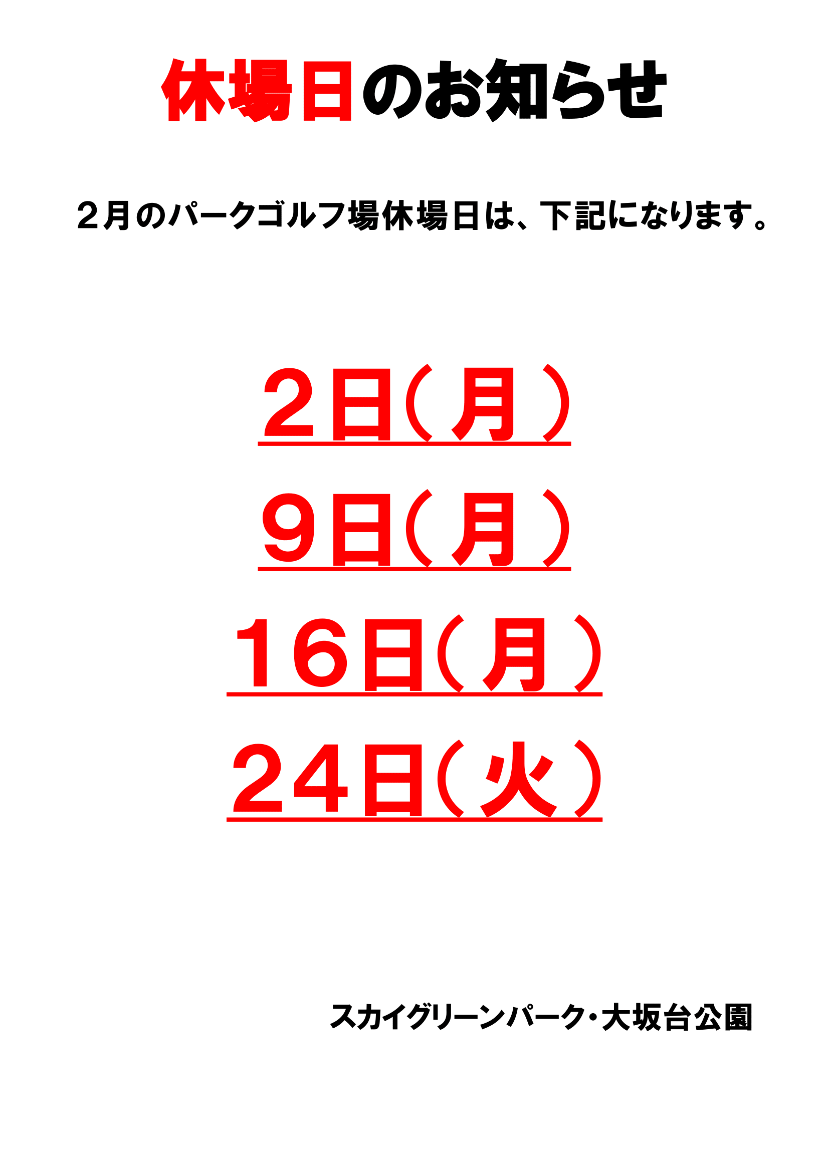 2月パークゴルフ場、休場日のお知らせ