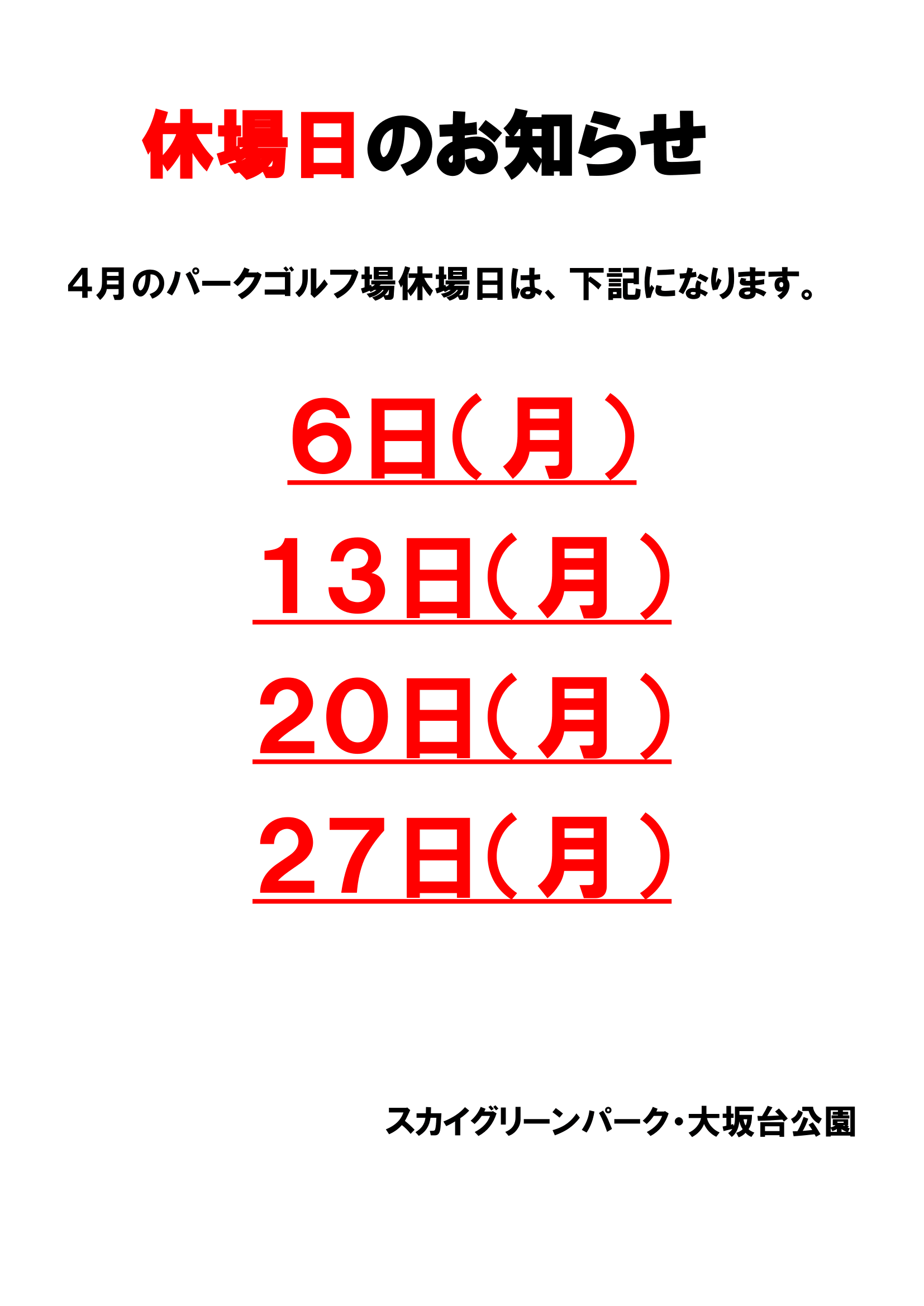 4月パークゴルフ場、休場日のお知らせ 2026年3月31日 最終更新日時 : 2026年3月31日 sph-sky-green-park 3月の休場日をお知らせ致します。 日程表をご確認の上、ご利用下さい。